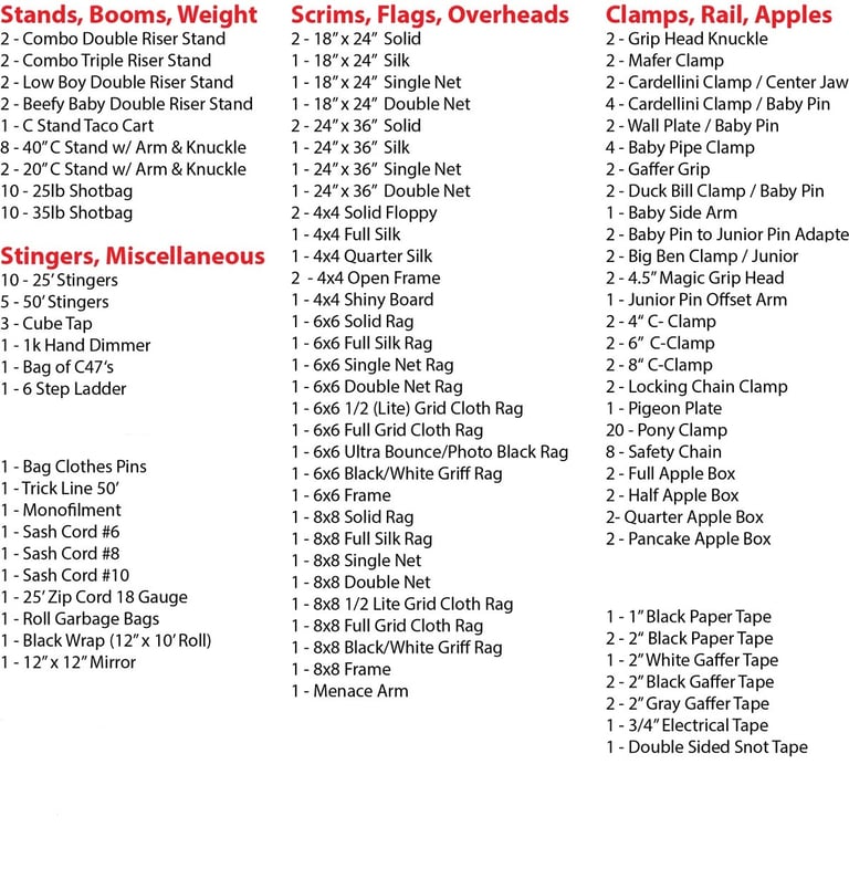 Also: Dana Dolly, Tripods, Generators & Battery Power, Monitors & Teradek Bolt Wireless Video. Chimera accessories, Joleko adapters, shiny board rentals, hazers … If you don’t see it here, please inquire